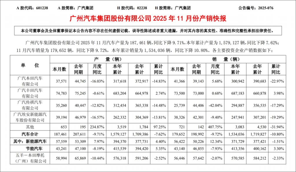 据集团发布的产销公告显示,整个广汽集团 11 月的汽车销量 179,652 辆,环比增长 5.2%。1-11 月的累计销量则达 1,534,036 辆,同比下滑了 10.8%。